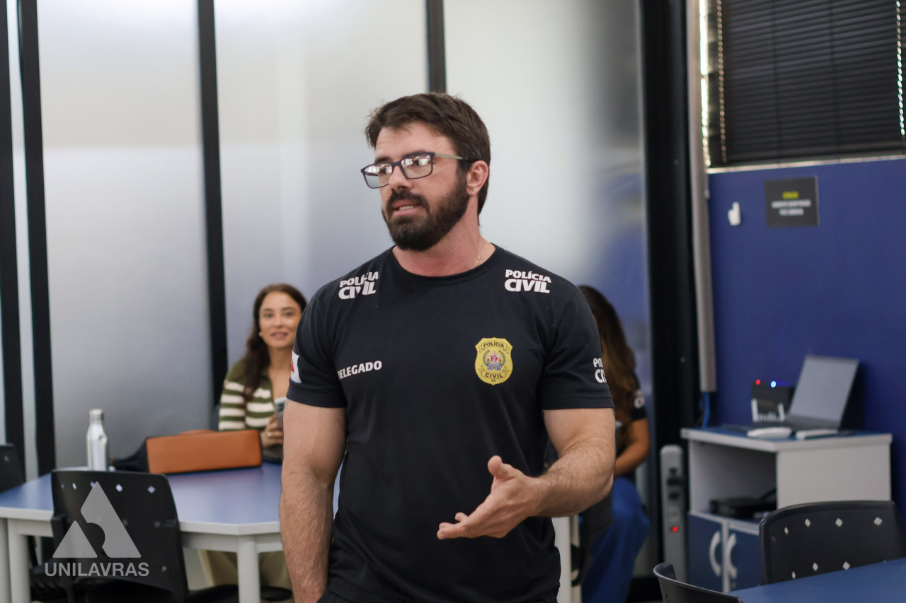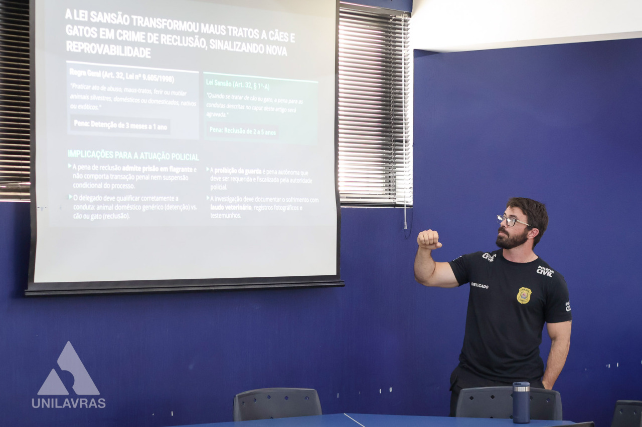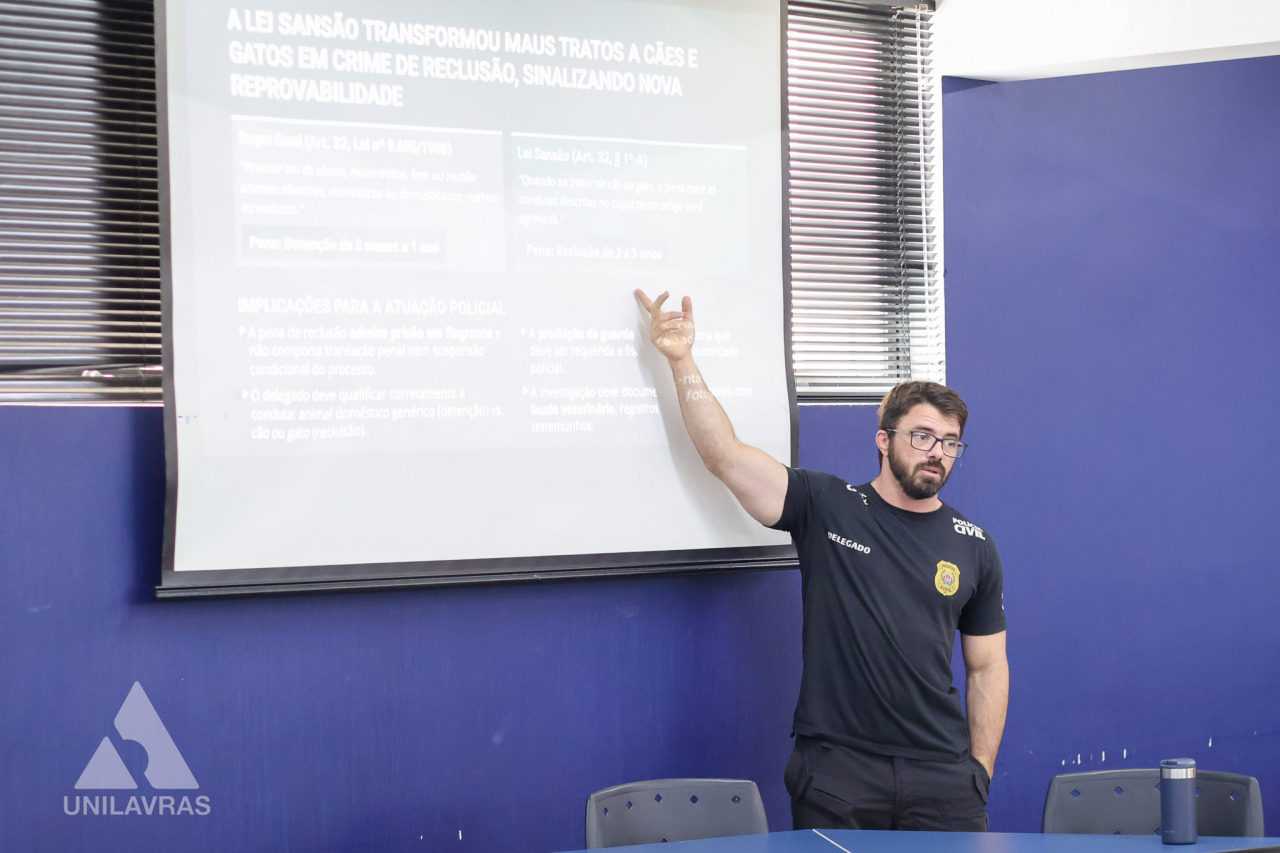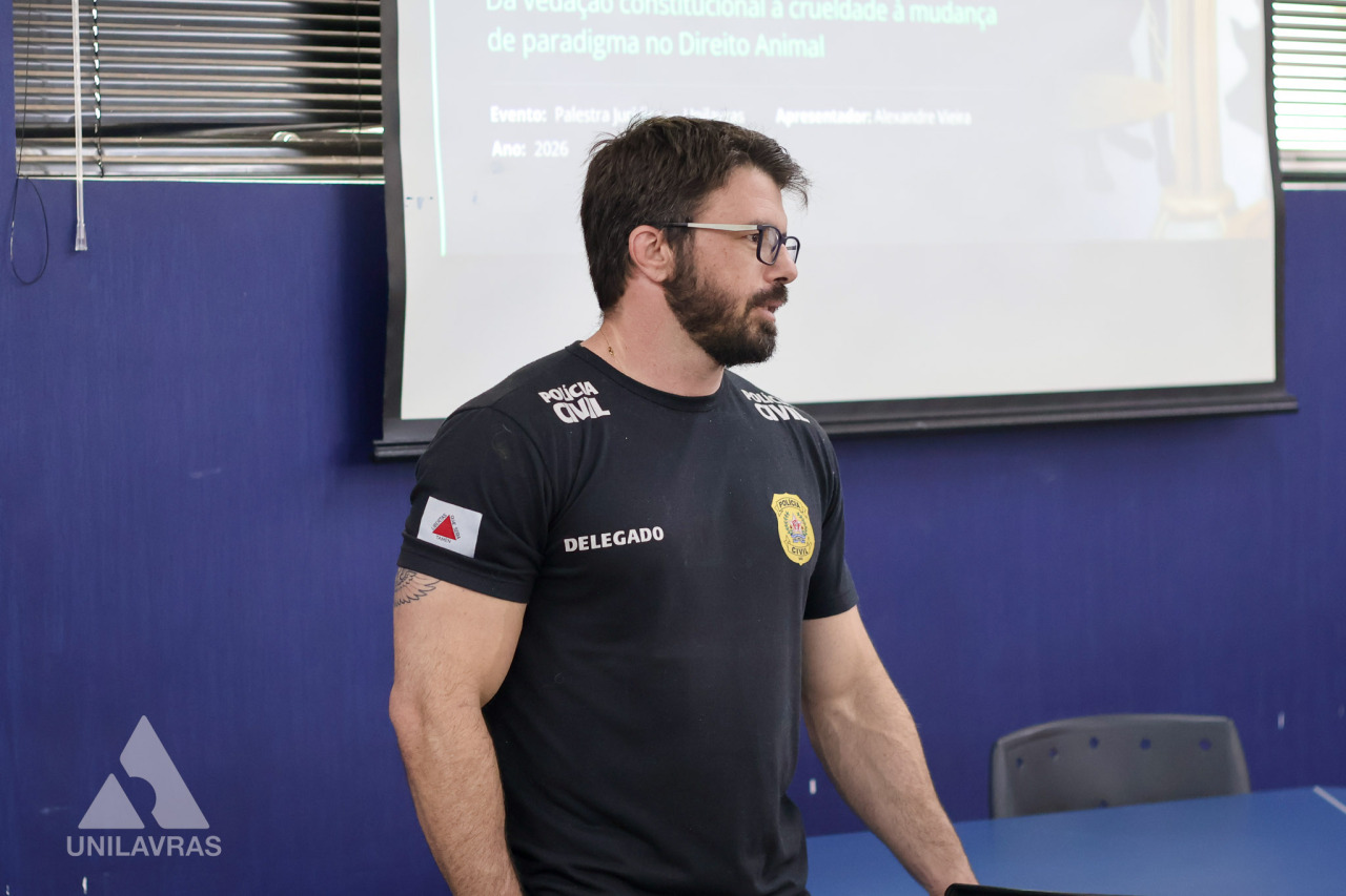 Os estudantes do 1º e do 10º períodos do curso de Direito do Unilavras participaram, na última quinta-feira (23), de uma palestra sobre a evolução jurídica da proteção aos animais e o combate aos maus-tratos, ministrada pelo delegado Alexandre Resende Vieira, titular da Delegacia de Investigações Gerais (DIG) de Lavras. A atividade integrou a disciplina Direito da Biodiversidade, sob coordenação da professora Erika Tayer Lasmar, e promoveu o diálogo entre o conhecimento acadêmico e a prática da investigação policial.
