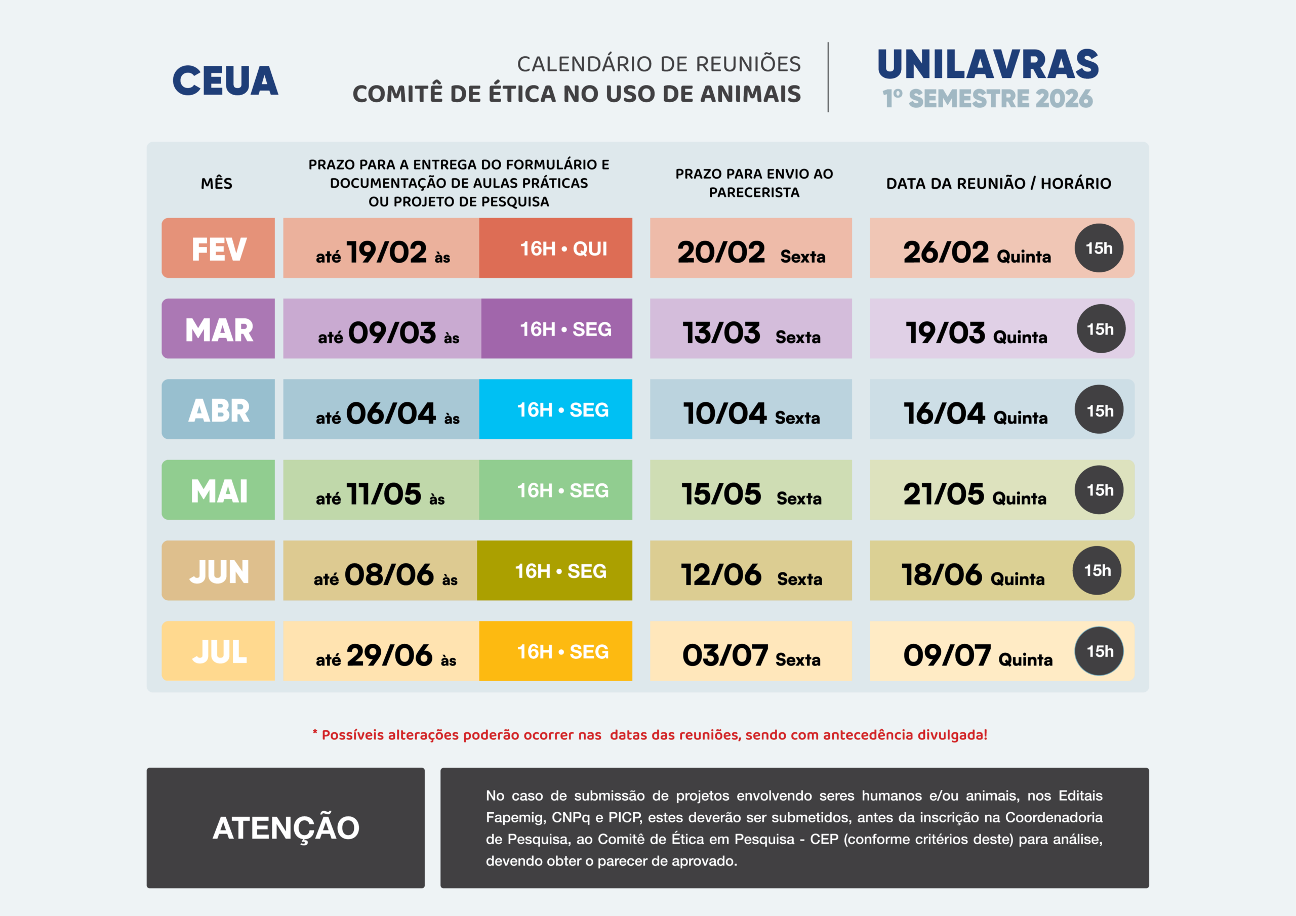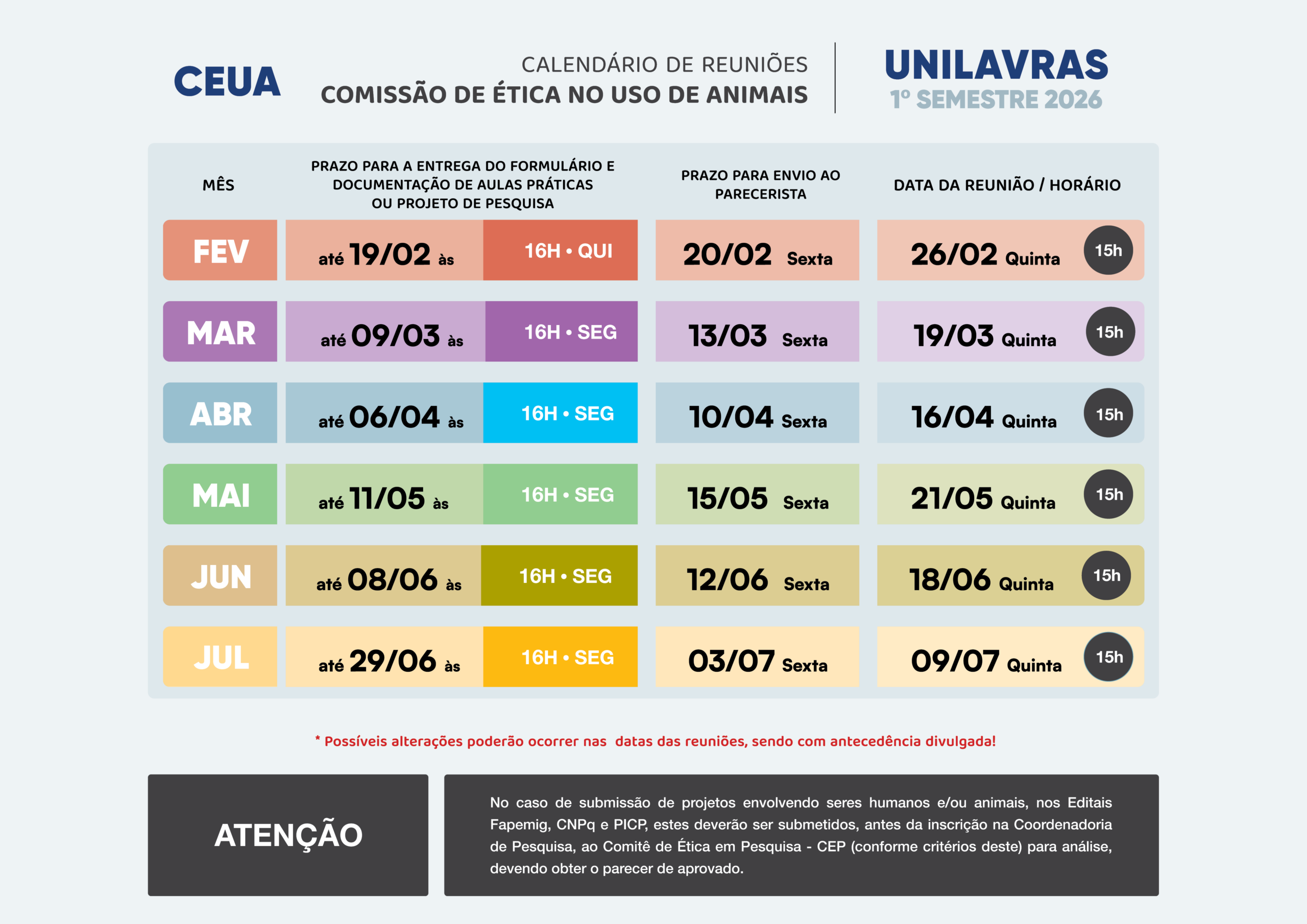 Antes de qualquer atividade envolvendo o uso de animais, o pesquisador/professor deverá entregar seu formulário à CEUA e só poderá iniciar a pesquisa ou atividade educacional envolvendo animais após a avaliação e aprovação da Comissão, apresentada em Parecer.