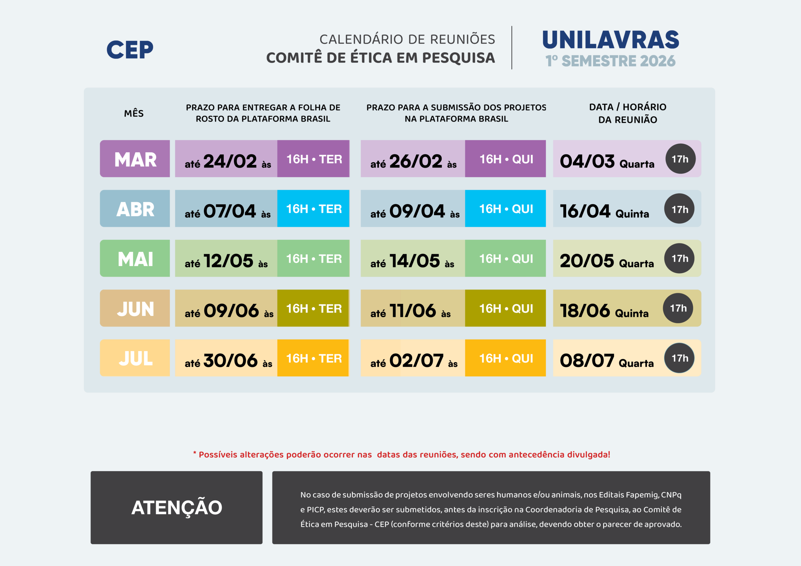 O CEP receberá até o dia agendado todas as FOLHAS DE ROSTO (Plataforma Brasil) dos projetos que envolvam o ser humano;